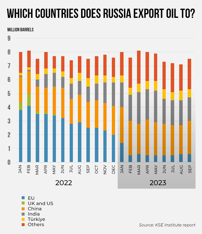 The Kremlin also managed to find an alternative to Western markets besides replacing Western tankers. The EU, the US, and the UK accounted for 55% of Russian oil consumption in early 2022. Raw materials have been transported mainly to China, India and Türkiye since the beginning of 2023.