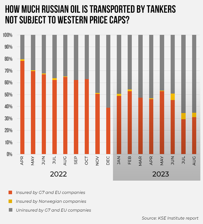 As of August, tankers that were not insured by EU or G7 companies delivered a total of 65% of Russian oil transported by sea. This compares to only 20% in April 2022.