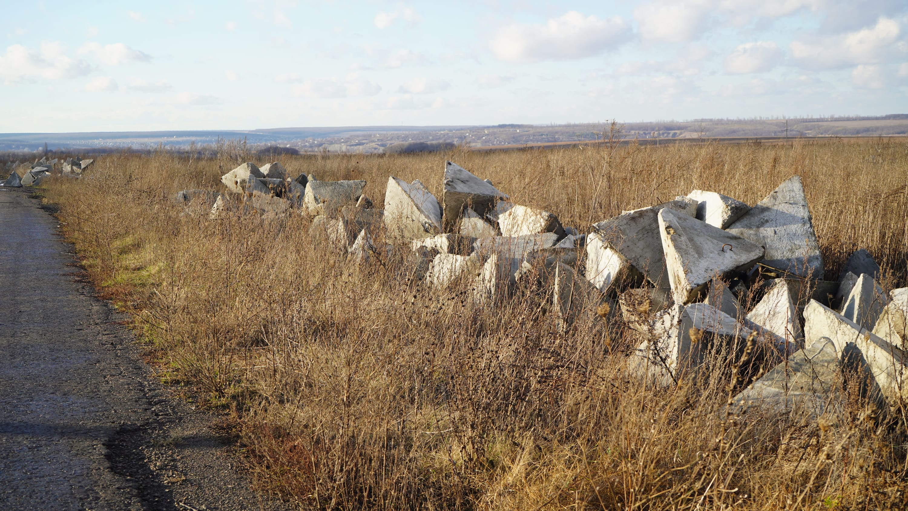 The anti-tank barrages have been pushed to the side of the road, but empty trenches and mine warning signs are reminders of the danger. For this reason, there is no sign of the once-numerous agricultural machinery in the fields, only grass swaying in the wind.