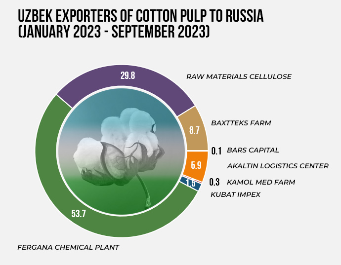 Other Uzbek companies are also suspected of exporting cotton pulp to the Russian military-industrial complex. Among them are Baxtteksfarm LLC, Fargona is Good LLC, JV LLC Akaltin Logistics Center by Order Omega Logistics DWC LLC, Kubat Impex LLC, and SZ LLC Akaltin Logistics Center by Order Omega Sonix Trade FZ LLC.