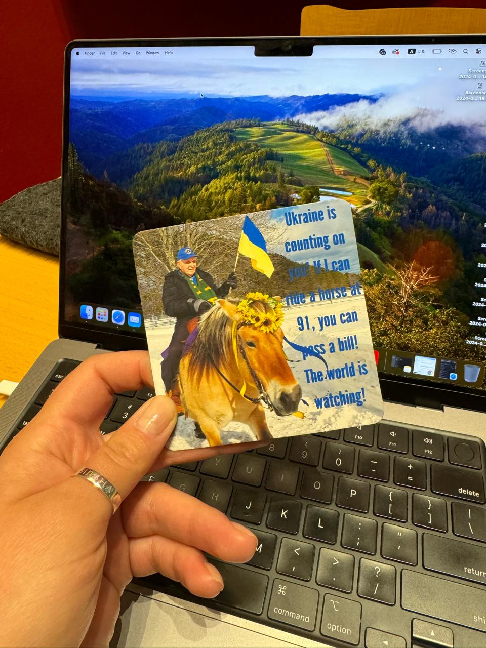 Vytautas and Nadija brought the flag to DC and took it with them to all of their meetings with members of Congress and senators. They have pledged to continue cherishing every single defender of Ukraine. And Vytautas brought the message on his card to the Hill, too: "If I can ride a horse at the age of 91, you can pass a bill. The world is watching. Thank you so much."