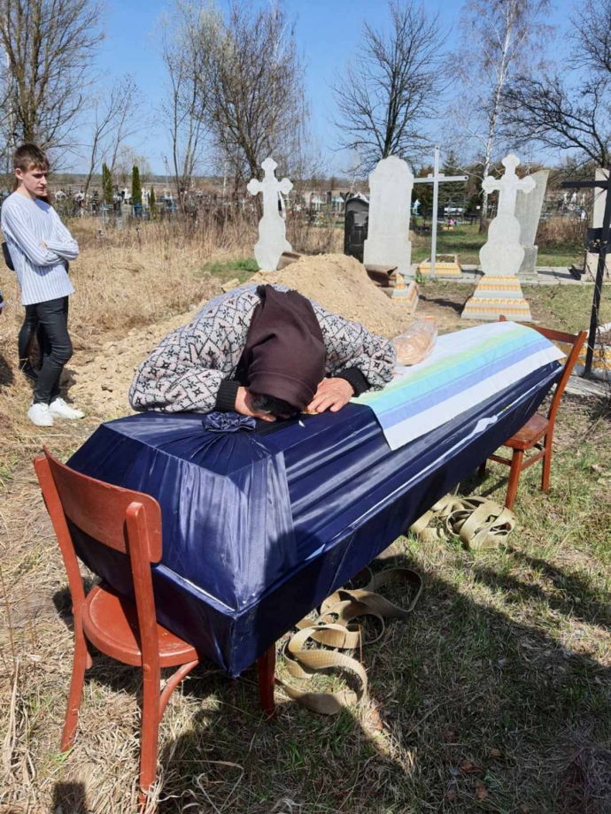 She began to search for her son’s body in the coffins that had already been loaded into the car. She found him under the name of Dmytro Koval. She recognised Ruslan by his sneakers – she’d bought them for him.