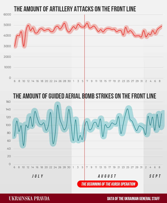 Nor, unfortunately, has the opening up of the Kursk front decreased the amount of artillery attacks and guided aerial bomb strikes on the front line as a whole. On the contrary, their number, just like the combat clashes, has slightly increased. There are an average of 4,500 to 4,600 artillery attacks per day, with the number of guided aerial bomb strikes ranging from 97 to 105.
