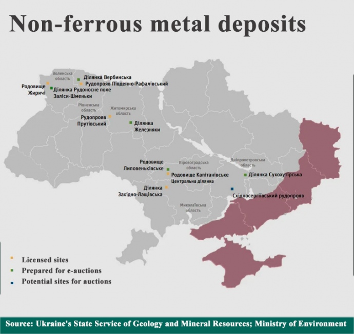 Reserves of tantalum pentoxide, niobium and beryllium in Ukraine have been recorded at six complex deposits. Tantalum and niobium are mined in non-commercial volumes, primarily as associated components of titanium placers. The prospects for rare earth metal mining are mainly tied to the development of the Novopoltavske apatite deposit and several other ore deposit occurrences.