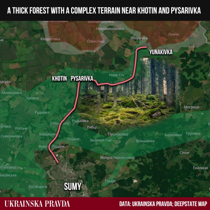 In essence, if we let the Russians into the forest near Khotin and Pysarivka, we will get a second Serebrianka Forest [a forest in Luhansk Oblast where intense fighting has been going on since autumn 2022 – ed.]. Perhaps an even more difficult battlefield, because the forest in Sumy Oblast is broad-leaved and has deep ravines.