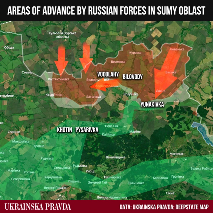 The Russians are five kilometres away from Pysarivka, and they are already on the outskirts of Yunakivka. Border guards flying drones over Yunakivka recorded Russians entering the centre of the village on motorcycles on 7–8 June. On 10 June, Ukrainian DeepState analysts, who update their map with a delay, marked about a third of Yunakivka as a "grey zone".