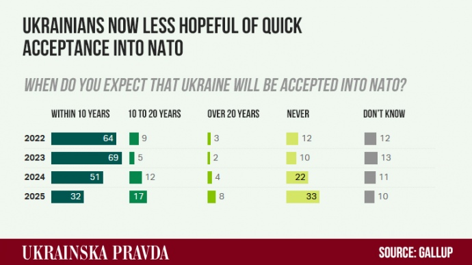 However, this figure also requires proper interpretation: the Ukrainians were "sacrificing" what they believe in the least. The Gallup survey mentioned previously showed that in Ukraine, the number of those who believe in the possibility of joining NATO within the next ten years has dropped to a record low in recent years – now only 32%. Meanwhile, 33% do not believe in the possibility of joining NATO at all.