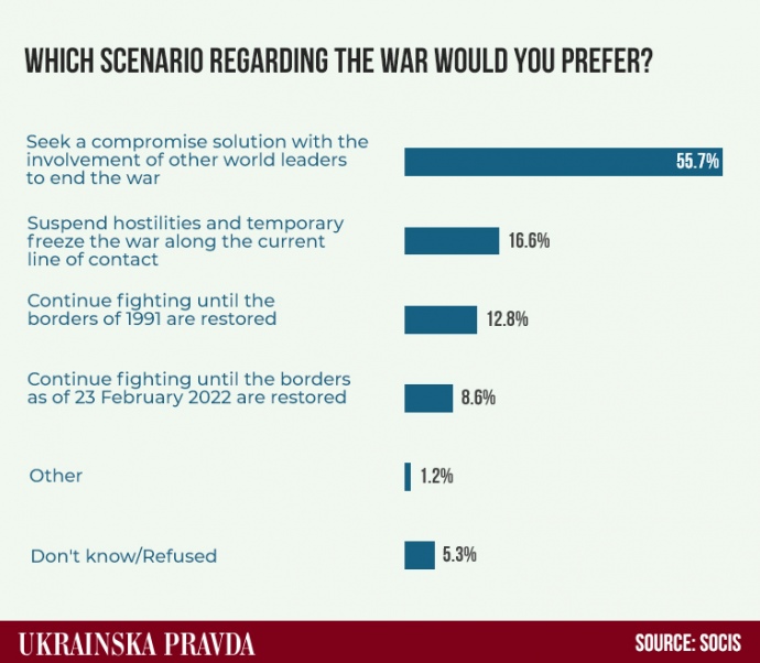 In June, similar data was published in Ukraine by the SOCIS sociological centre. According to its survey, just over 20% supported continuing the war until certain goals were achieved (the 2022 borders or even those of 1991), while roughly 70% favoured a freeze or the start of international negotiations.