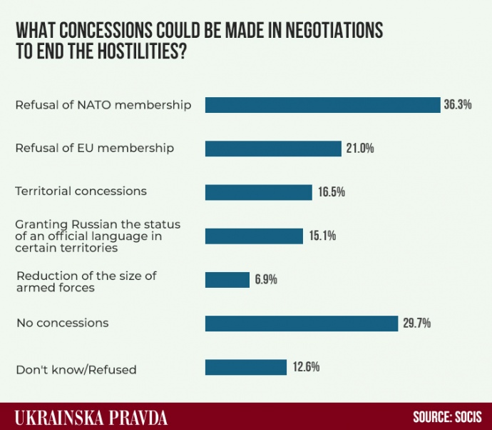 In the SOCIS poll, there was also a question about possible concessions. In an open question with multiple-choice answers, about 30% of respondents opposed any concessions to Russia.