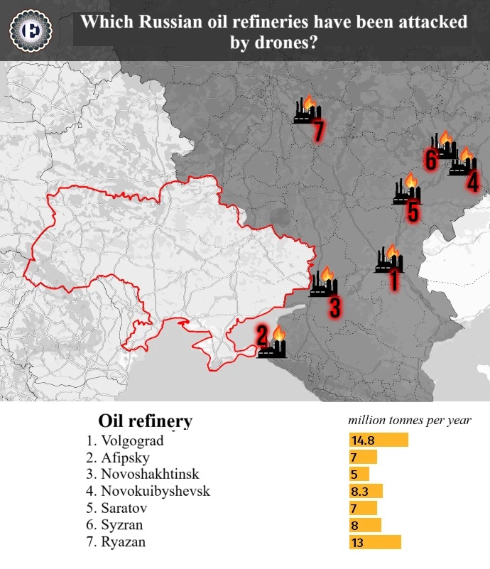 The first to be targeted were the Ryazan and Novokuibyshevsk refineries. The Ryazan refinery, which processed 13.1 million tonnes of oil per year (around 5% of Russia's total refining capacity), shut down following a strike on 2 August. On the same day, the Novokuibyshevsk refinery, which used to process approximately 8.3 million tonnes per year, was also hit by drones.