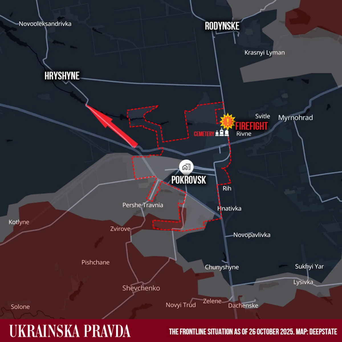 By 26 October, when the General Staff of the Armed Forces of Ukraine publicly acknowledged for the first time that Russian troops are present in Pokrovsk, isolated Russian groups had already passed through the city and were fighting on its northern outskirts, particularly near the cemetery on the road towards the settlements of Rodynske and Dobropillia.