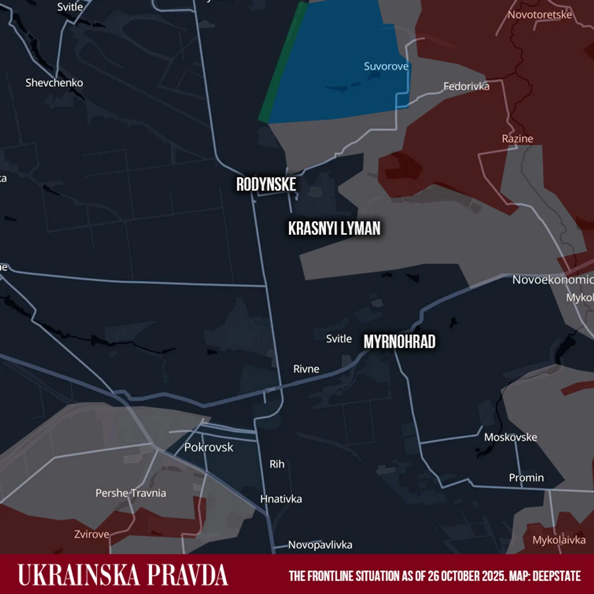 "If Pokrovsk falls, there will be no way out for the garrison in Myrnohrad," one officer on the Myrnohrad front told Ukrainska Pravda. "Our supply line to Myrnohrad is over 20 km long. Rotations are almost impossible. We can't evacuate the fallen. [The Russians] are pressing towards Rodynske, and Chervonyi Lyman is already under their control. People are working at their limit, and they realise that encirclement is getting closer."