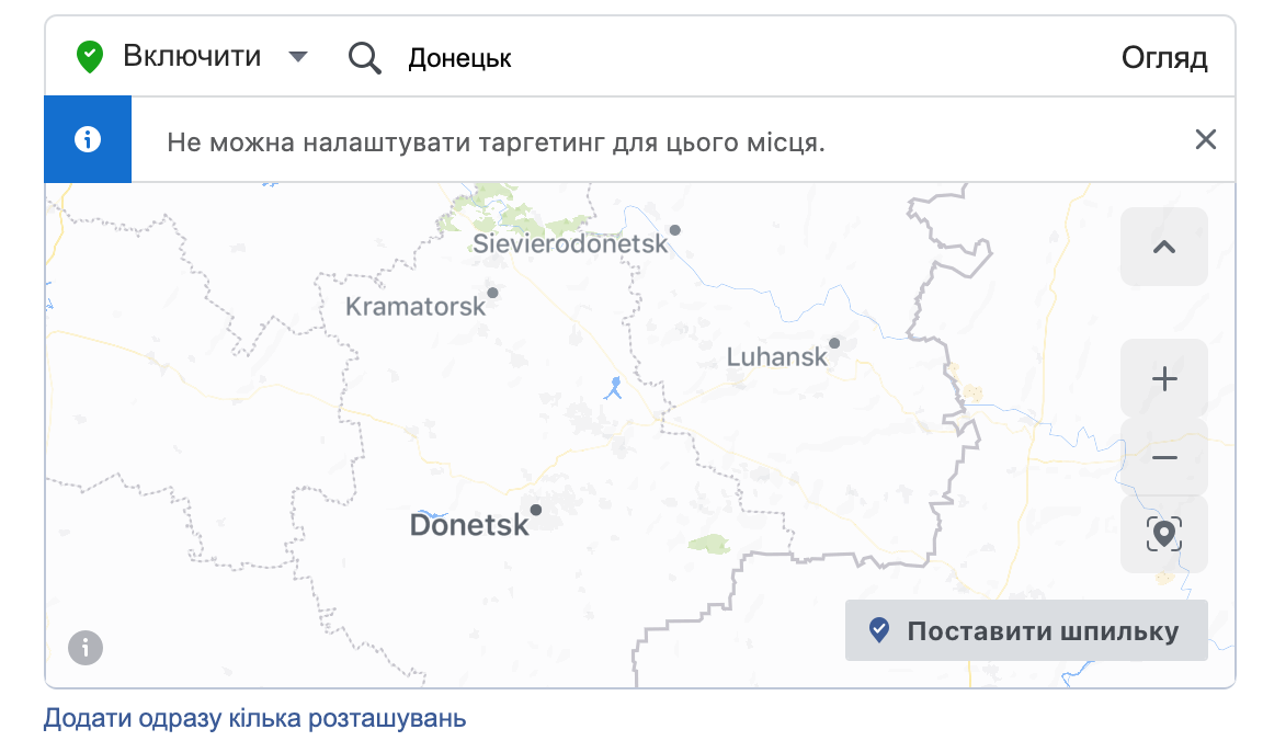 However, in addition to users from the AR Crimea, it seems that the occupied territories of Donetsk and Luhansk regions have also been excluded from global targeting. In particular, if you try to target advertising, for example, at users from Donetsk or Luhansk, Facebook informs it is impossible to do. In fact, it is not just about banning targeting for users from certain cities in the temporarily occupied territories. If you set up advertising targeting throughout Ukraine, it will not be available in Donetsk and Luhansk. However, unlike Crimea, there is no information about the exclusion of TOTs from global targeting; nor is there any public explanation or position of Meta regarding the introduction of such a ban.