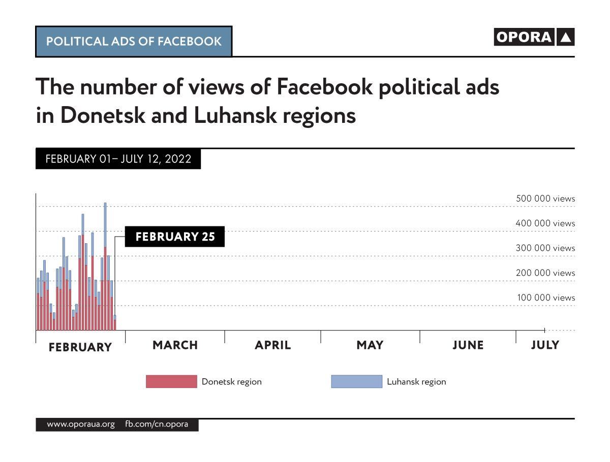 After February, 24, for the safety of users, Meta immediately hid the previously public information about customers of political advertising. But, as it turned out, these were not the only changes in the company's policy on advertising posts. Analysis of political advertising data showed that Ukrainian users from Donetsk and Luhansk regions stopped engaging with advertising after February, 25. The infographics below shows the number of views of political advertising by Facebook users from Donetsk and Luhansk oblasts from February, 1 to July, 12.