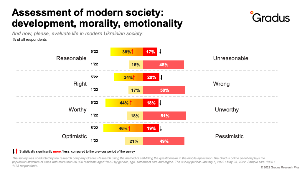 It seems that extreme living conditions for more than 10 months should radically disrupt the usual flow of life and lead to the destruction of people/s vision of the world. At the same time, real changes can be assessed only by knowing what vision of the world preceded it. To do this, we will compare the results of two survey waves conducted by Gradus Research in January and May 2022.