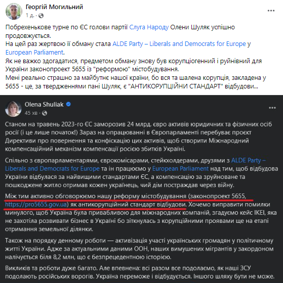 One aspect that deserves special attention is that Olena Shuliak is the head of the committee responsible for local self-government. However, her actions at this event worked against local self-government. It is undeniable that there is a corrupt component at the local level when it comes to construction. Nobody disputes that. However, draft law 5655 does not address the problem of corruption at the local level; instead, it hands over the fate of communities to developers, as written in the Mirror of the Week publication. Therefore, the author's statements about the draft law are manipulative.