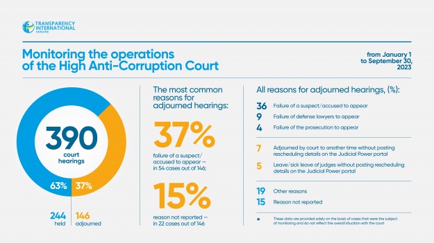 Quite often, consideration is delayed due to the postponement of meetings by judges. As part of the monitoring in 2023, our lawyers attended 390 hearings. Of these, 244 (63%) took place and 146 (37%) were postponed. Common reasons for postponement include: