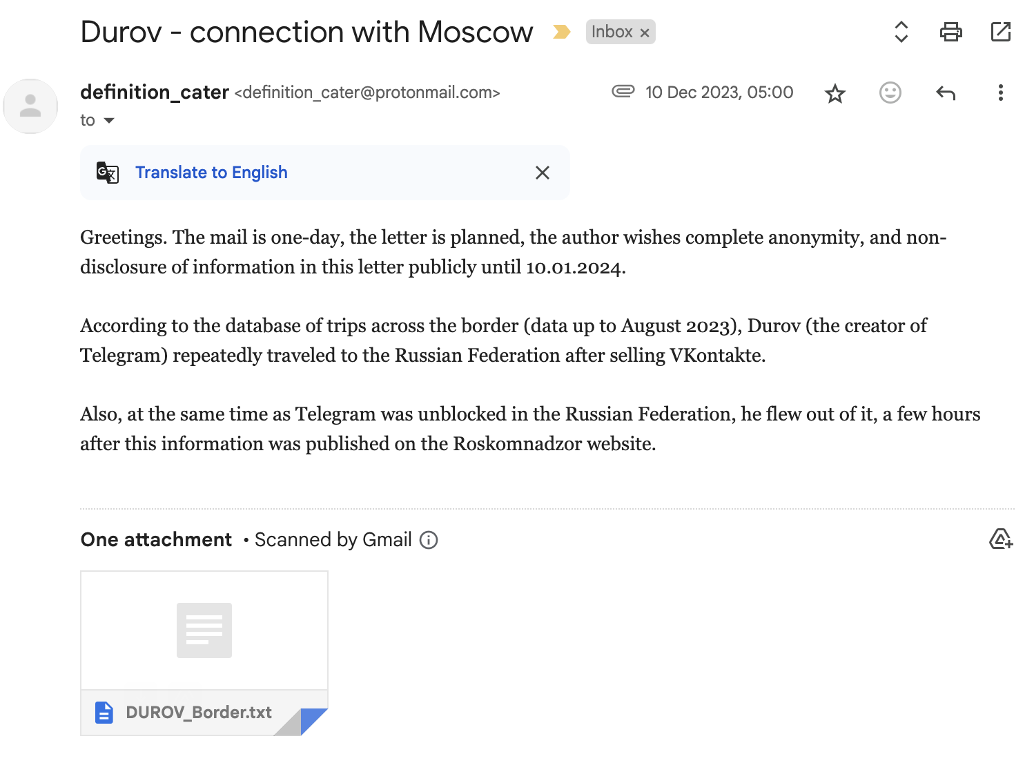 On November 10, 2023, we received an email with an alleged extract from the database of border crossings by Pavel Durov to and from Russia between 2016 and 2021 (61 entry and 64 exit records). See both the original and google-translated screenshots of the email is below, and as you can see, the author requests that the content not be published for a month from the date of receipt of the email.