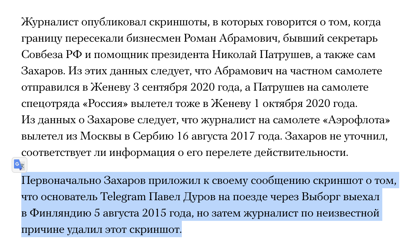 Medusa claims that as a confirmation that the data in the database is genuine, Zakharov published data on border crossings by Abramovich, Patrushev, Durov and Zakharov himself. But then, for some unknown reason, he deleted the screenshot with Durov, leaving the other three - https://t.me/zakharovchannel/1416.
