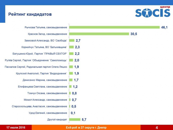 Opposition Bloc reported that according to the exit poll by the International Analytical Center for Sociology, the winner in Dnipro is city councillor Zahid Krasnov with 45.1% of votes, and Tetiana Rychkova has 41.3% of votes.