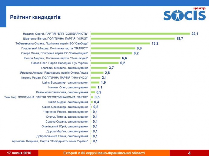 Winning Verkhovna Rada by-election candidates drawing the most media attention are Maksym Mykytas, independent candidate (#206 district in Chernihiv, 32%), Serhiy Nasalyk of Petro Poroshenko Bloc (#85 district in Ivano-Frankivsk, 22.1%), and independent candidate Tetiana Rychkova (#27 district in Dnipro, 46.1%), according to the exit poll carried out on commission from the Committee of the Voters of Ukraine NGO.