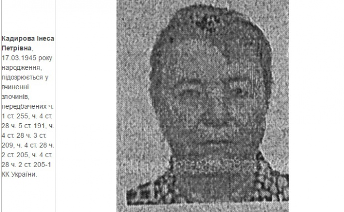 Inesa Kadyrova, b. 1945, is suspected in crimes according to the p.1 Art. 255 and others.