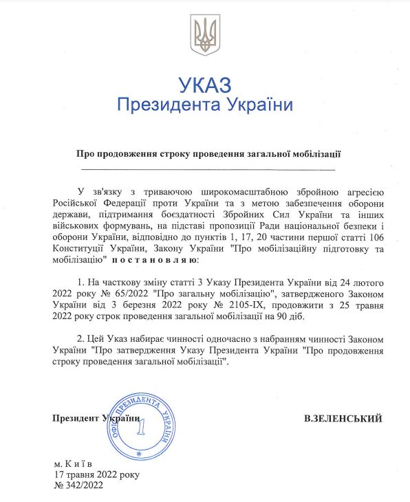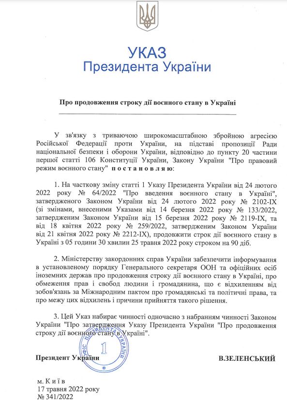 - On February 24, President Volodymyr Zelenskyy imposed martial law in connection with the start of the full-scale Russian invasion of Ukraine. After that, martial law in Ukraine was extended twice: from March 26 for another 30 days until April 25, and for another 30 days until May 25.