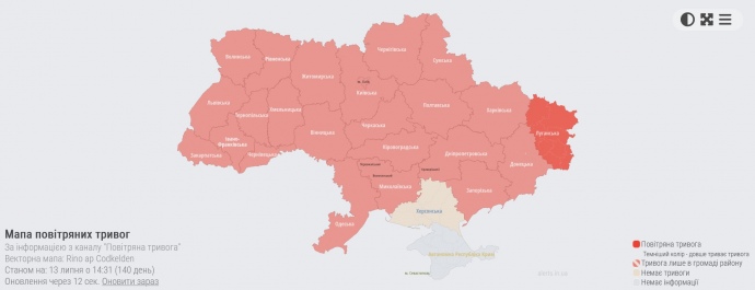 An air raid alert has been activated in all regions of Ukraine, with the exception of Kherson Oblast.
