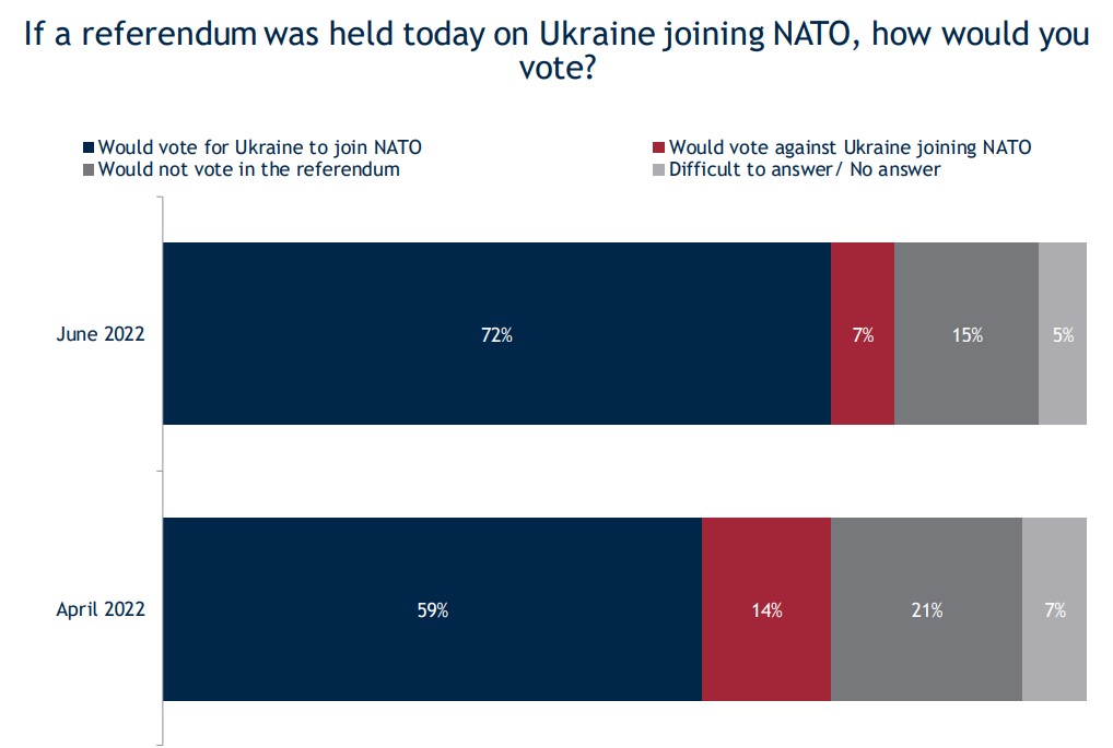 Support for NATO membership has increased in recent months. Seventy-two percent of Ukrainians would back joining NATO if a referendum were held today. That is a jump of 13 percentage points from a poll conducted in April.