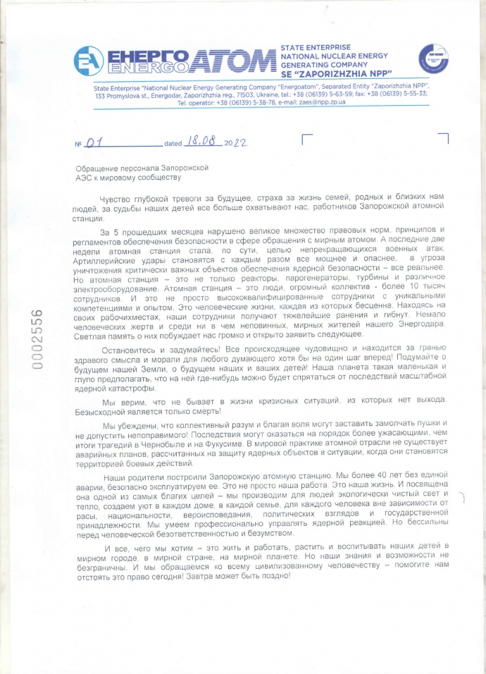 "Our planet is too small to believe that there will be a place where one could hide in the aftermath of a large-scale nuclear disaster," the statement signed by the ZNPP staff reads.