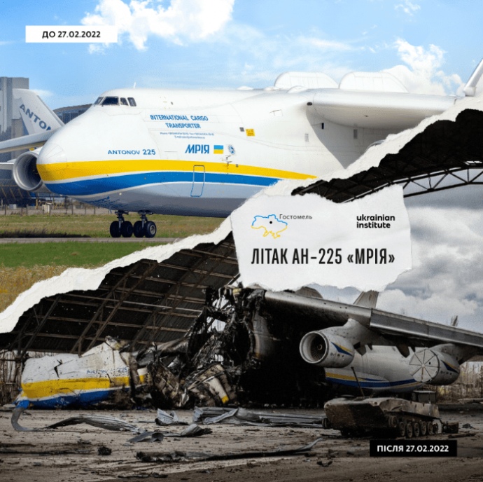 However, on 27 March, 2022, Russian warplanes attacked Hostomel airport and destroyed the world's largest and most powerful transport aircraft, which became a symbol of peace, mutual assistance and support that countries around the world provided to each other.