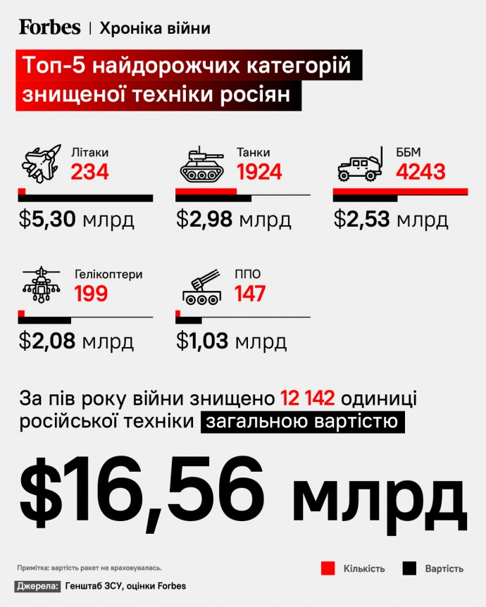 Forbes did not include in the estimate of losses the value of the missiles that Russia fired at Ukraine or the ones that were shot down, because it is difficult to calculate their exact number.