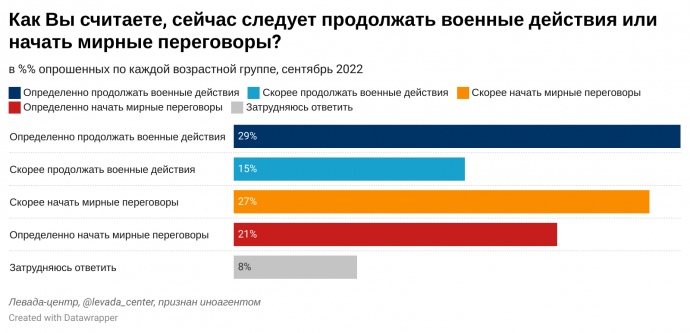 Reference: The nationwide survey by the Levada-Center was conducted on 22-28 September 2022, based on a representative all-Russian sample of the urban and rural population of 1,631 people aged 18 and older in 137 villages, towns and cities across 50 constituent entities of the Russian Federation. The research is conducted at respondents’ homes through personal interviews.