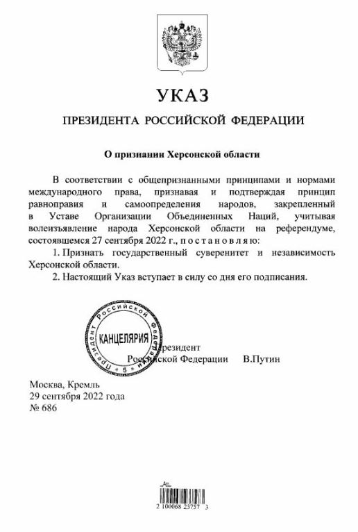 Quote: "In accordance with the generally accepted principles and norms of international law, recognising and affirming the principle of equality and self-determination of peoples enshrined in the United Nations Charter, and taking into account the will of the people of Kherson Oblast expressed in the referendum held on 27 September 2022, I decree: the sovereignty and independence of Kherson Oblast shall be recognised".