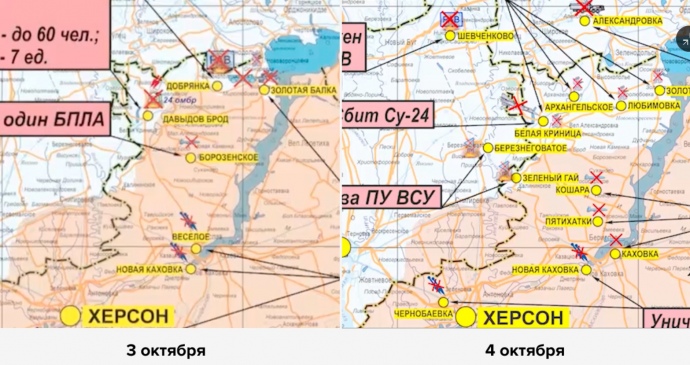 The map also shows the retreat of Russian troops in the north of Kherson Oblast. The previous day, the front line on the map ran near the settlements of Davydiv Brid, Dobrianka, and Zolota Balka. On 4 October, the Defence Ministry showed that the Russian army controlled the territory approximately up to the line between Davydiv Brid and Dudchany.