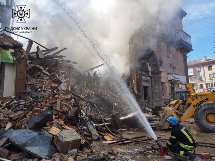 Quote from the State Emergency Service: "As of 14:30, rescue workers are continuing to conduct clean-up operations after the rocket attack on a residential building in Zaporizhzhia. State Emergency Service employees have pulled out three bodies from under the rubble of the building."