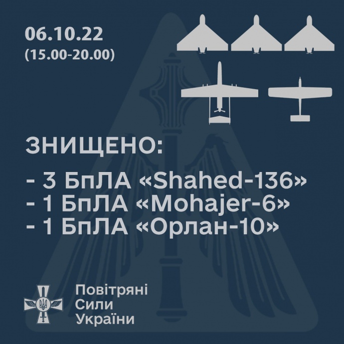 Details: These are three Iranian Shahed-136 kamikaze drones, one Iranian Mohajer-6 attack unmanned aerial vehicle and one Orlan-10 operational-tactical UAV.