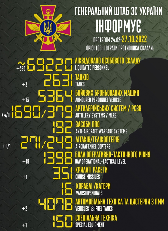 Details: Total combat losses of the Russian forces between 24 February and 27 October 2022 are estimated to be [figures in parentheses represent the latest losses - ed.]: