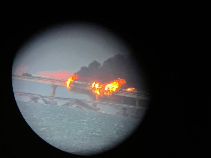 RIA Novosti reported that a fuel tank caught fire on the bridge. The arches that allow ships to pass have not been damaged.