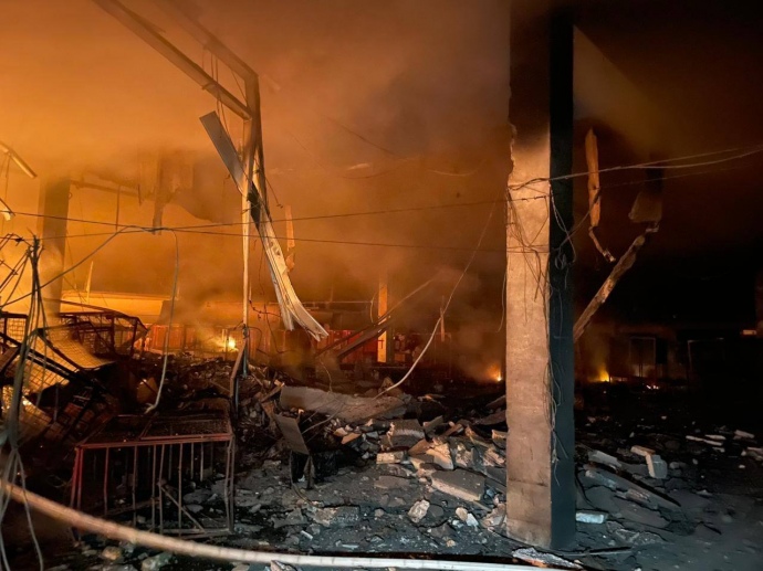 The enemy strike caused a large fire. Over 300 square metres were on fire. Fire fighters have extinguished the flames. The business’s warehouses have been destroyed."