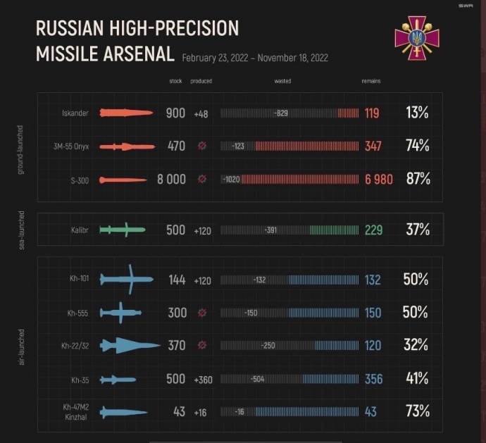 More details: According to the graph, Russia still has 119 Iskander cruise missiles (13% left), 347 3M-55 Oniks anti-ship missiles (74% left), 6,980 S-300 anti-aircraft missiles (87%), 229 Kalibr cruise missiles (37%), etc.