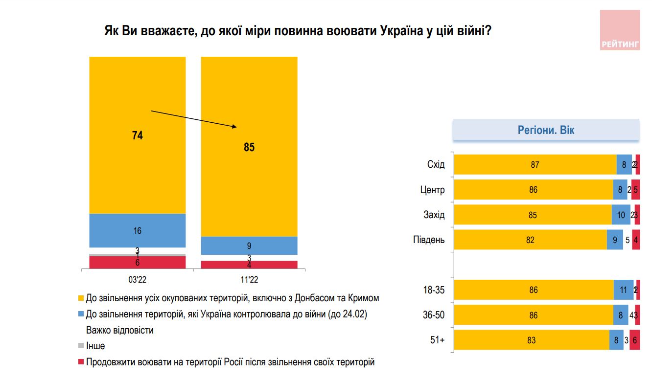 Quote: "Since the beginning of the full-scale Russian invasion, the conviction that Ukraine's victory in the war is the liberation of all its territories, including Crimea and occupied Donbas, has increased (from 74% in March to 85% in November 2022).