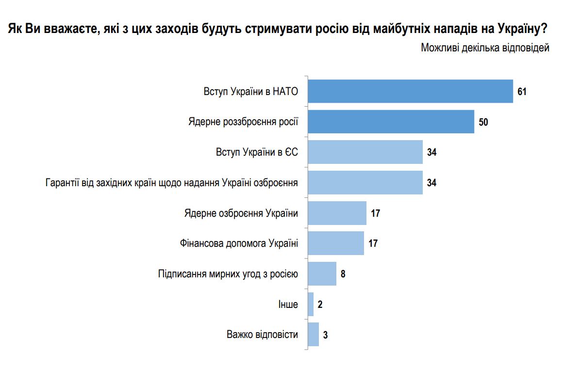Ukraine's accession to the EU and guarantees from Western partners regarding the supply of weapons to Ukraine as deterrence methods are supported by 34% of respondents.