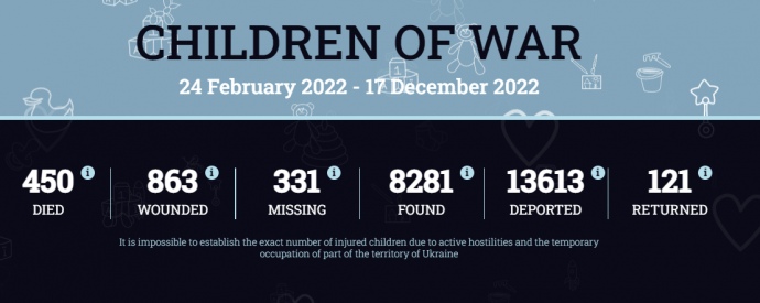 As of the morning of 17 December, more than 1,313 Ukrainian children have been killed or injured in Russia’s full-scale war against Ukraine.