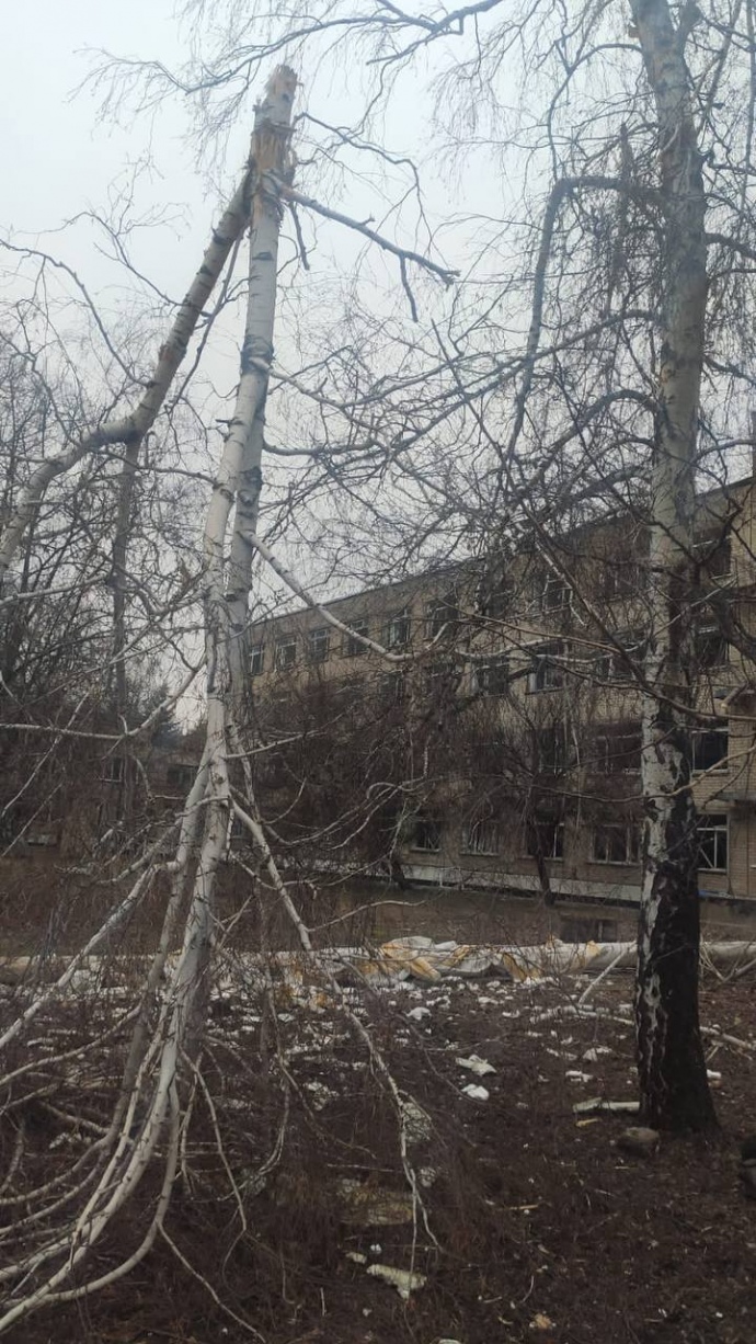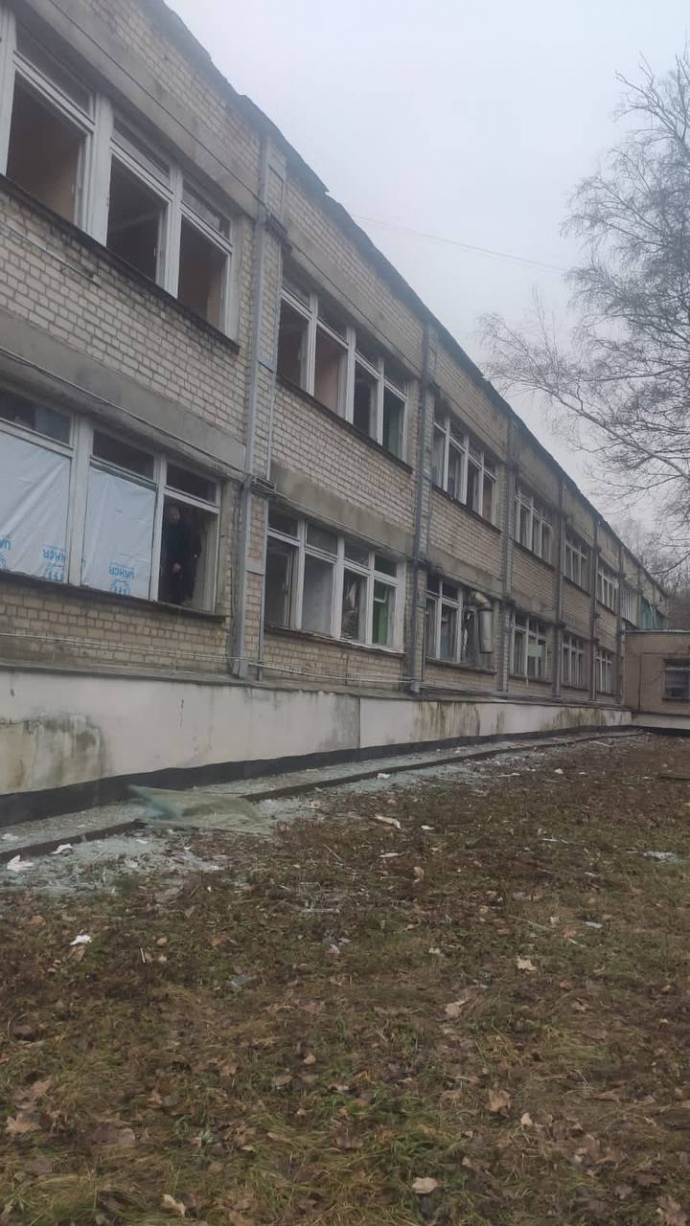 Details: Syniehubov added that the local hospital has been damaged as well; windows were smashed and there is destruction reported.