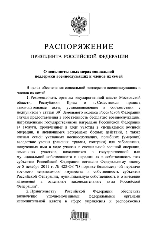 Details: According to the decree, Putin decided to give land to military personnel awarded for their merits in the war, the veterans, and relatives of the perished army servicemen.