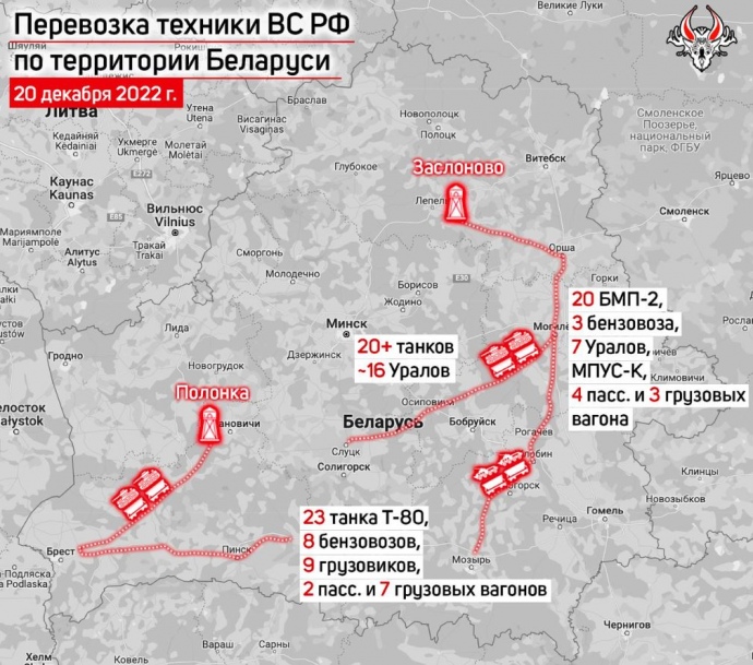 On 20 December, an echelon of Russian military vehicles departed from Polonka railway station; the vehicles were previously stationed at Obuz-Lesnovsky firing range (Baranovichi district, Brest Oblast). The platforms carried 23 T-80 main battle tanks, eight petrol carriers, nine Urals and Kamaz vans, as well as two passenger cars and seven freight cars.