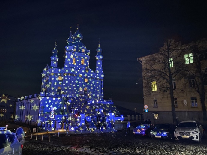 On the first day, the artist arranged illuminations on St. Andrew's church, the National Museum of History of Ukraine, the bell tower of St. Michael's Golden-Domed Monastery, the building of the Hennadii Udovenko Diplomatic Academy of Ukraine and the bell tower of St. Sophia Cathedral.