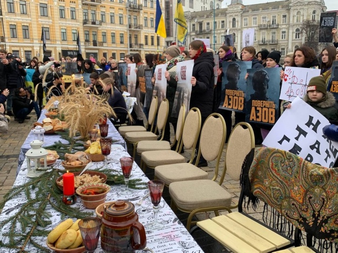 People with banners "Where is Azov?", "Bring Azov back", "Azovstal – to get everyone back alive", etc. are standing behind the table.