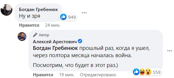 The adviser also "made a joke" under his own post on the social network. According to Arestovych, the last time he wanted to resign, a full-scale invasion had begun.